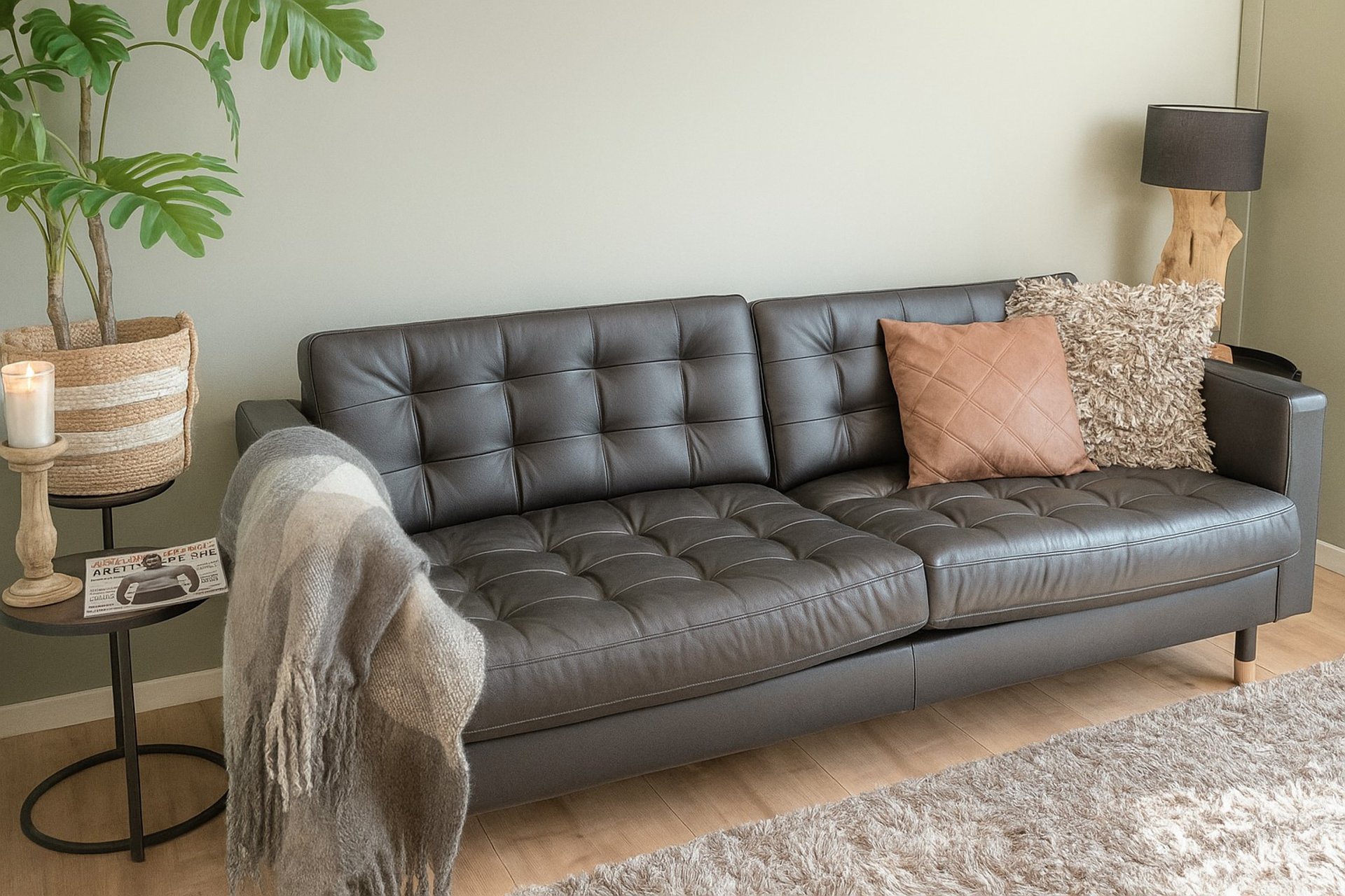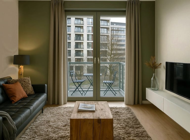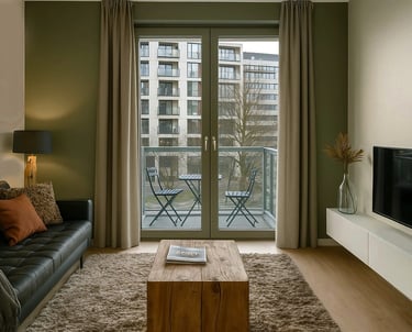 Door te kiezen voor een zorgvuldig afgestemde kleurencombinatie van lever, zwart, mosterd en wit is er een uitstekende balans ontstaan tussen warmte en contrast. Het interieur krijgt hierdoor een eigentijdse uitstraling die toch rustig en harmonieus aanvoelt. Dit effect wordt versterkt door het gebruik van natuurlijke en duurzame materialen zoals leer, (onbewerkt) hout, linnen, dierenvacht en metaal, waardoor het appartement een karaktervolle en tijdloze sfeer uitstraalt.