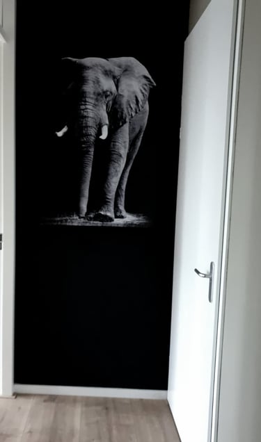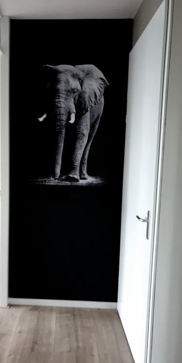 de smalle wand aan het eind van de hal oogt oneindig door het zwart te verven.