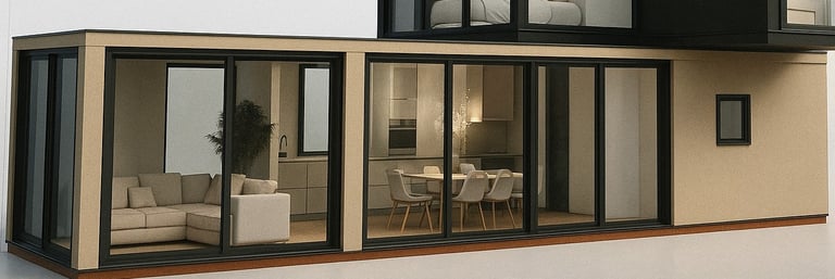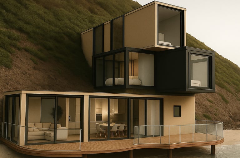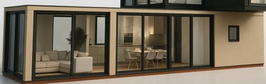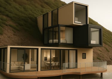 Op de woonetage van de containerwoning draait alles om licht, ruimte en uitzicht. Het kloppend hart van deze verdieping is de royale woonkamer met een enorme glazen pui die de hele voorzijde beslaat. Deze schuifpui scheidt én verbindt de leefruimte met de royale veranda. Zodra de deuren openstaan, vloeien binnen en buiten naadloos in elkaar over en ervaar je een adembenemend panoramisch uitzicht op zee.