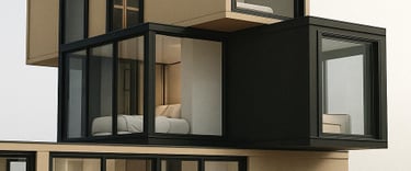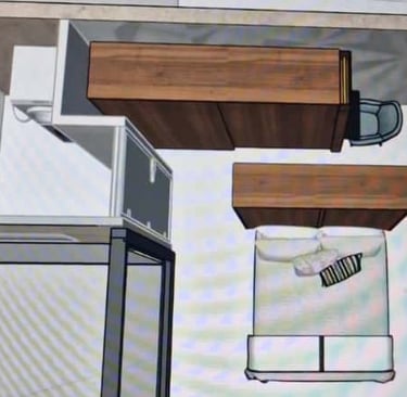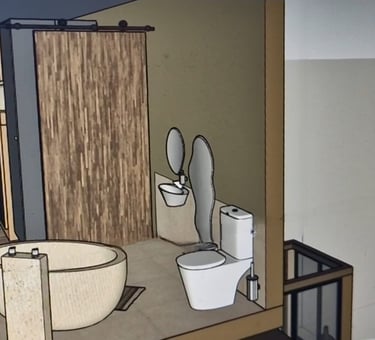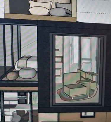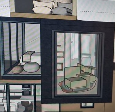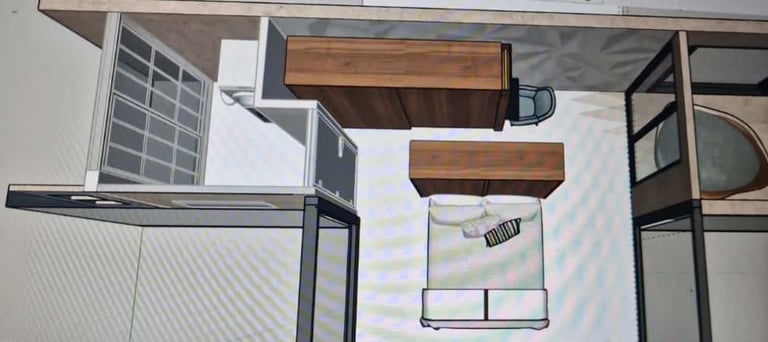 Dit project - ik heb het "Geen Water te Diep" genoemd - was een bijzondere uitdaging: niet alleen het interieur, maar de volledige woning mocht ik ontwerpen. Van vier containers en twee koppelstukken heb ik, in de rol van zowel ontwerper als architect, een unieke leefruimte gecreëerd voor een jong stel met een tweeling van vier jaar. Hun wens: een woning die zo duurzaam mogelijk gebouwd en ingericht zou zijn.