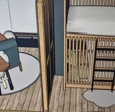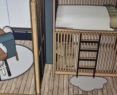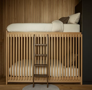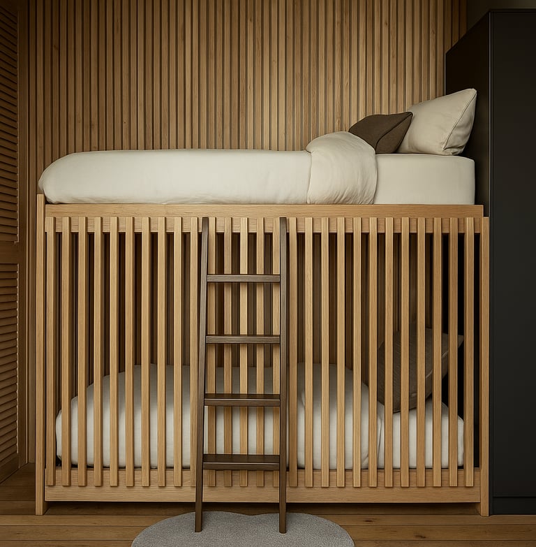 Op de hoogste verdieping bevindt zich het domein van de kleuters: een speelse en doordachte tweelingkamer. Speciaal voor hen ontwierp ik een bijzonder stapelbed dat gespiegeld is uitgevoerd. Zo klimt de een aan de ene kant naar binnen, terwijl de ander zijn eigen toegang aan de tegenoverliggende kant heeft. Het bed is gemaakt van duurzame houten latten: stevig, natuurlijk én met een slim ontwerp waardoor beide kinderen hun eigen stukje privacy ervaren, maar toch met elkaar in contact blijven door de openingen tussen de latten.