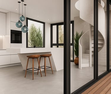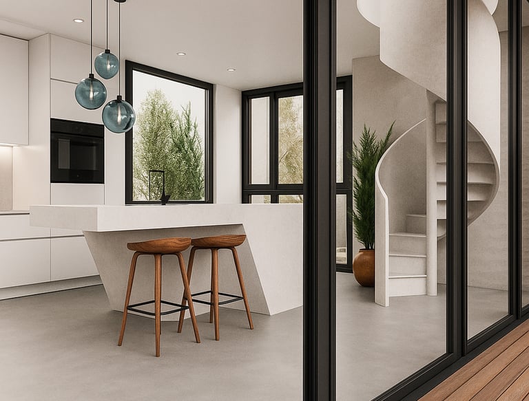 De keuken vormt een stoer, modern statement in het interieur. Het asymmetrische kookeiland is niet alleen praktisch, maar geeft ook een speelse dynamiek aan de ruimte. Hier komen natuurlijke en duurzame materialen samen: het warme hout contrasteert met koel glas en stoere metalen accenten. Industriële deuren zorgen voor een stijlvolle scheiding tussen de verschillende functies, terwijl de openheid en lichtinval behouden blijven.