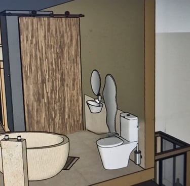 De absolute eyecatchers zijn de badkamer en de serre. De badkamer is deels in de heuvel geïntegreerd, waardoor de douchecabine grenst aan een robuuste stenen wand. Dit natuurlijke element geeft de ruimte een uniek en bijna grotschilderachtig karakter – rauw, aards en toch verfijnd.