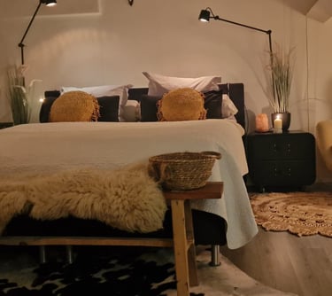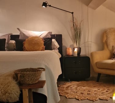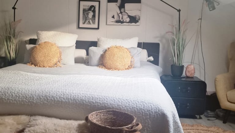 Door het gebruik van wit (muren) en zwart (meubels en armaturen) voelt de ruimte niet alleen ruimtelijker, maar ook stijlvol en tijdloos. Terwijl bohemian accenten – van gevlochten manden tot rotan details en een vleugje Ibiza – wat speelsheid en een zomerse vibe aan het geheel toevoegen.