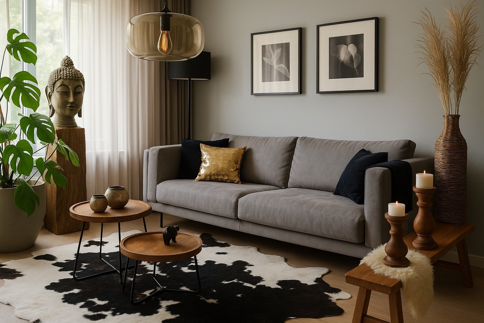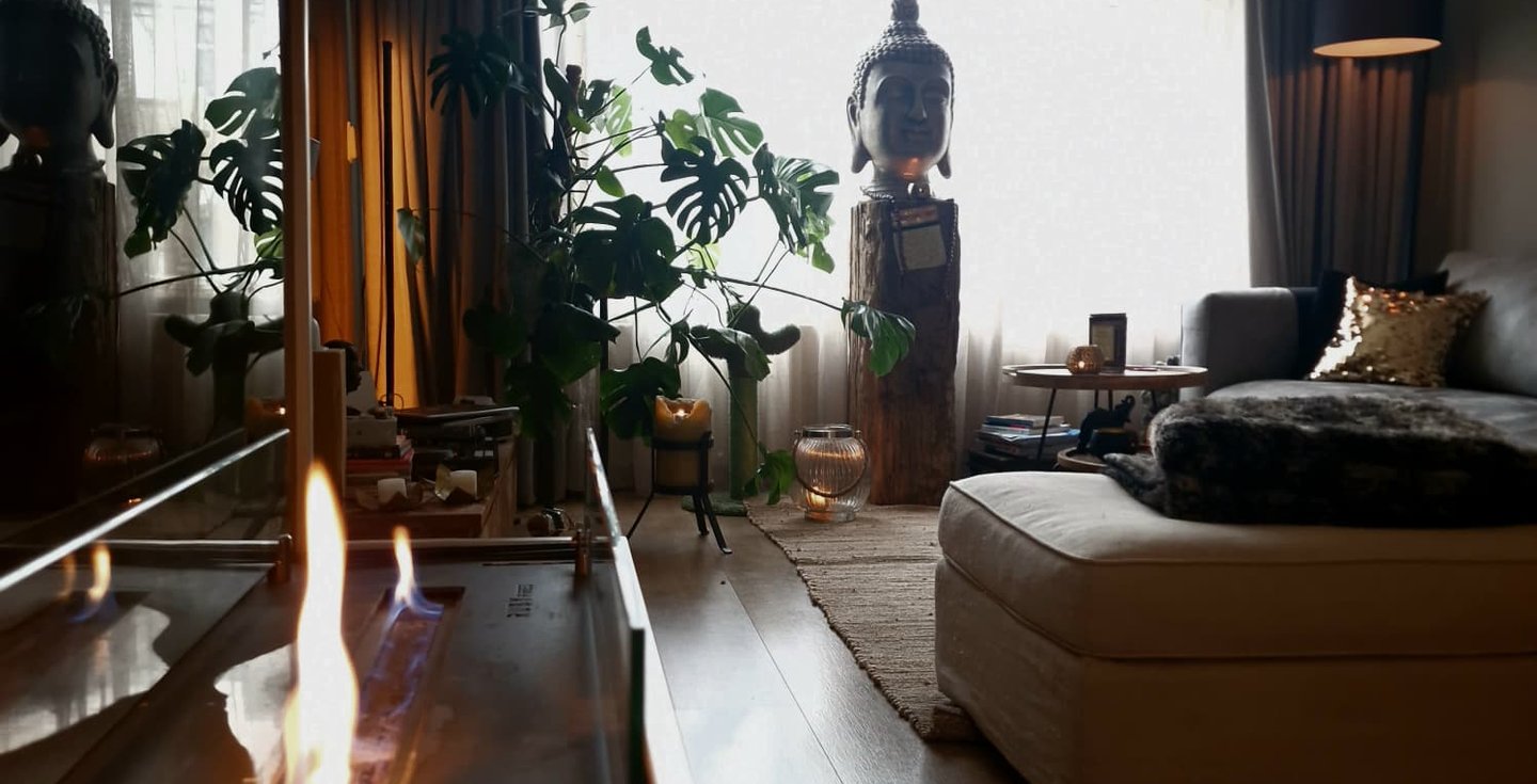 De huiselijke warmte komt vooral tot uiting in het gebruik van natuurlijke materialen. Onbewerkt hout, grote groene planten en etnische accessoires zoals Boeddhabeelden brengen een gevoel van rust en verbondenheid met de natuur. Een koeienhuid als vloerkleed en een geitenhuid op de eettafel voegen extra textuur en karakter toe, en geven de ruimte een stoere en unieke uitstraling.